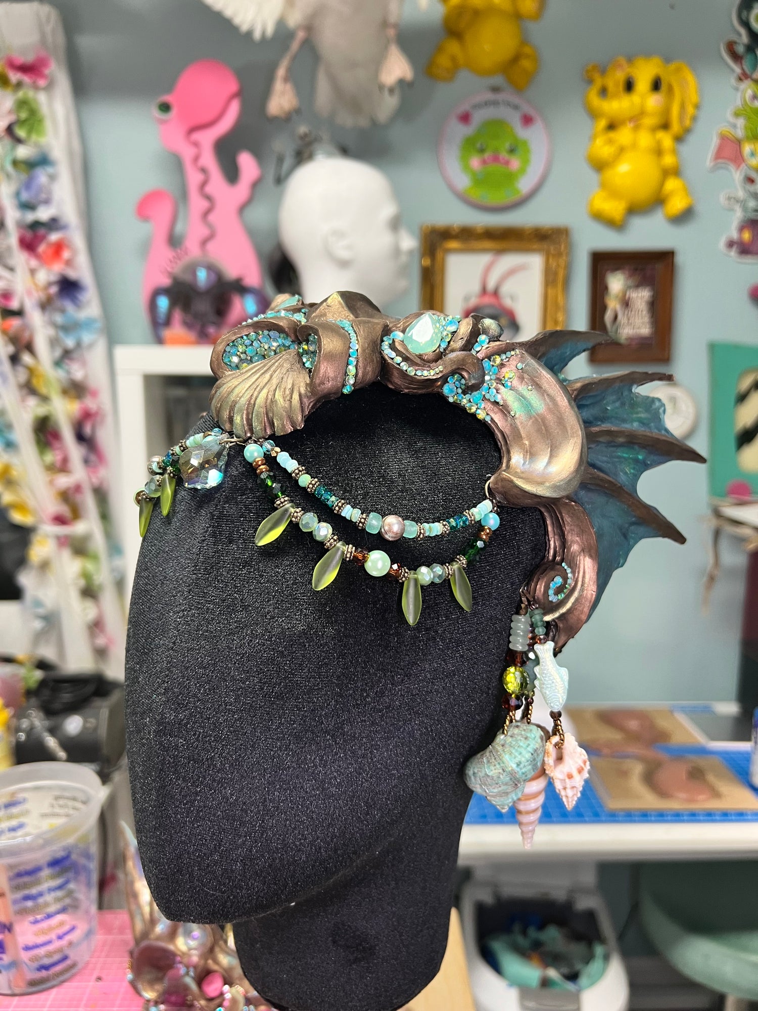 care: dry after every use, there are a few metal components. Do not leave in sun. It is a resin piece and can easily change shape if heated too much. We recommend storing it on a mannequin head